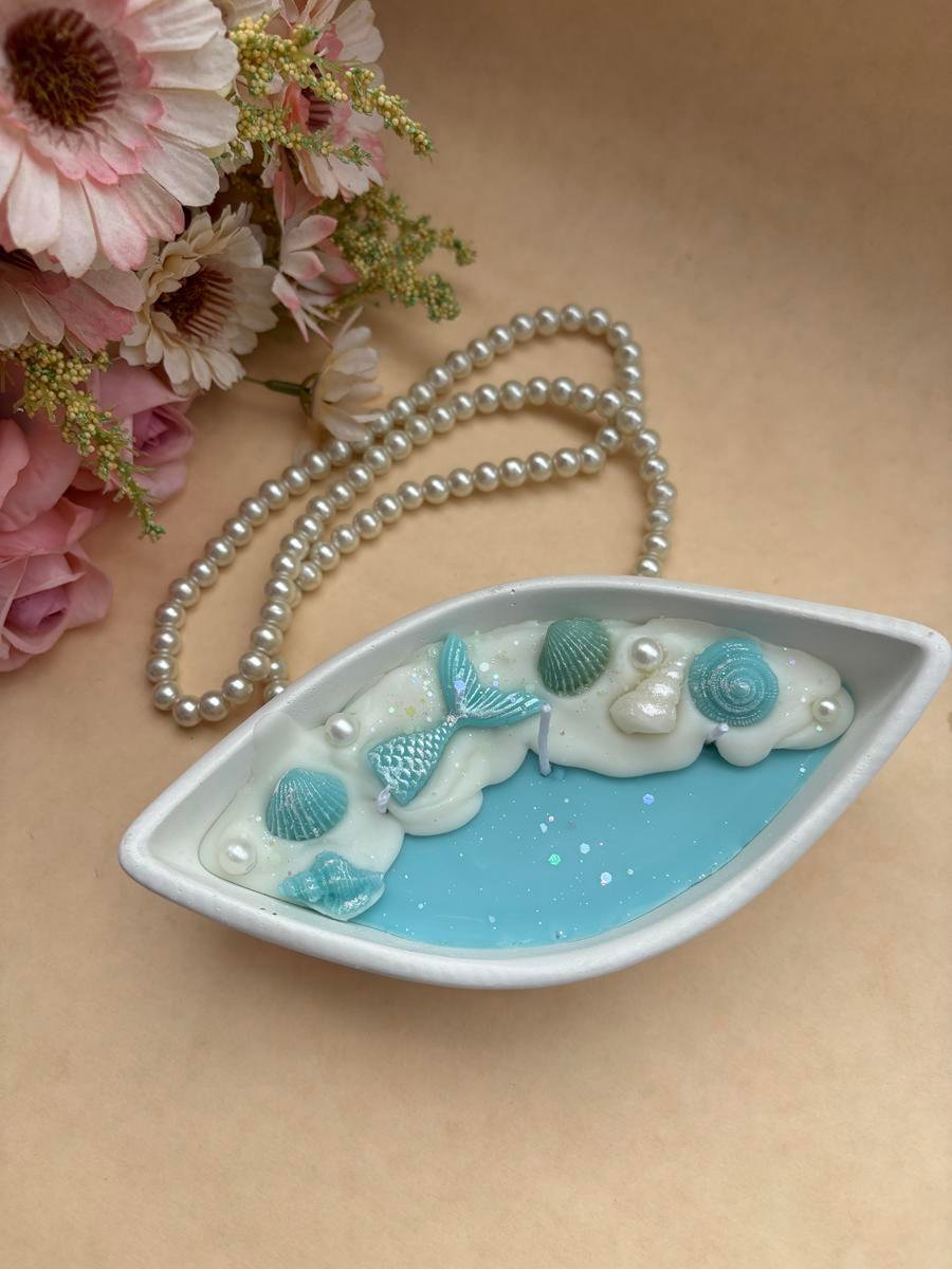 Beach Boat Candle made with soy wax and premium fragrance….topped with shells & pearls..