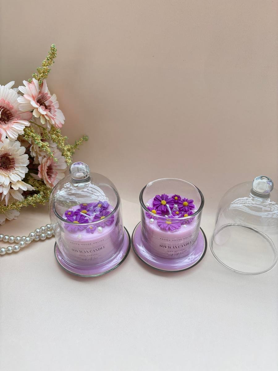 Purple bell Jar Candle made with soy wax and premium fragrance ….topped with beautiful purple colour flowers….