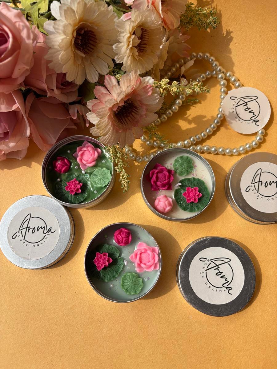Lotus Pond tin jar candle made with soy wax & premium fragrance …topped with beautiful lotus & leaves..