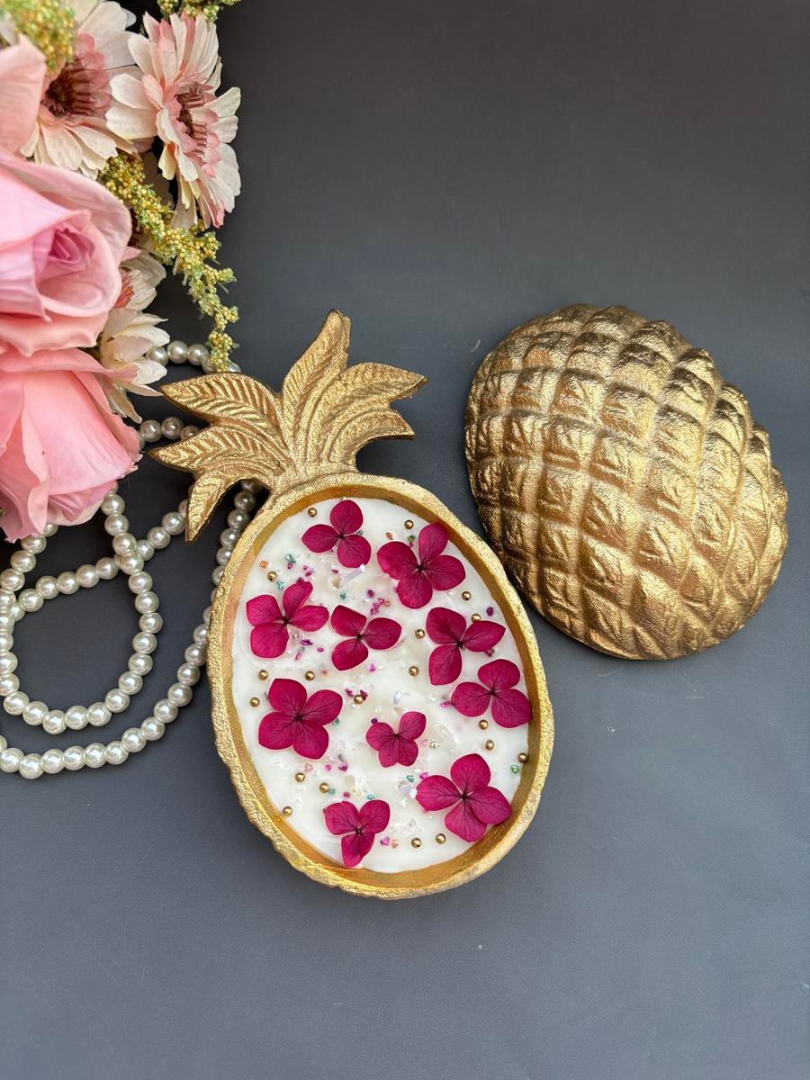 Pineapple Urli candles made with soy wax and premium fragrance….topped with beautiful dry flower,,