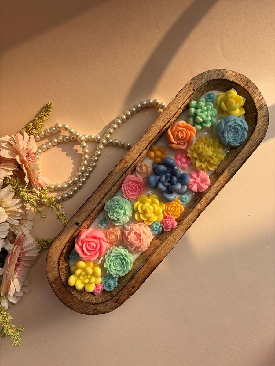 Succulent Wooden Boat candle made with soy wax and premium fragrance…topped with beautiful assorted flowers & succulents..