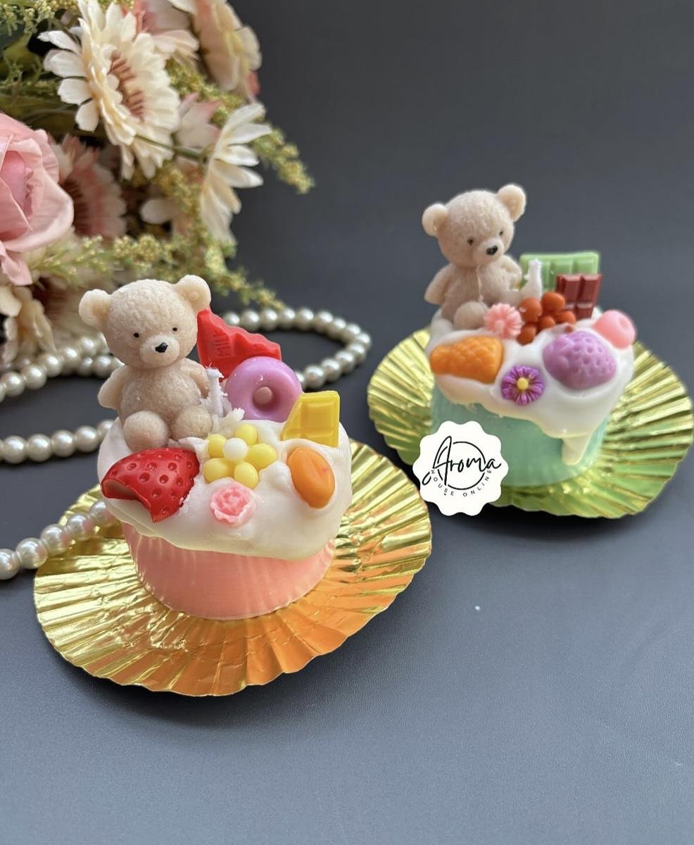 Teddy Cake candle made with soy wax and premium fragrance…topped with beautiful teddy flowers, fruits etc..